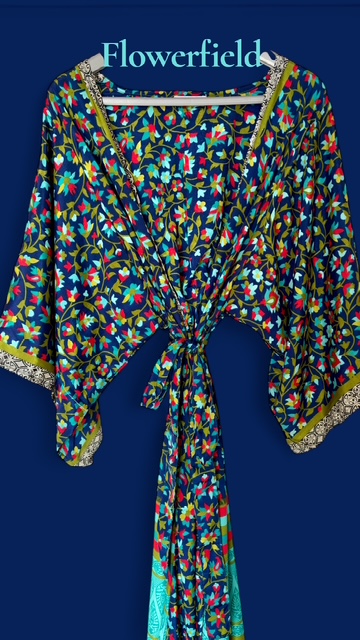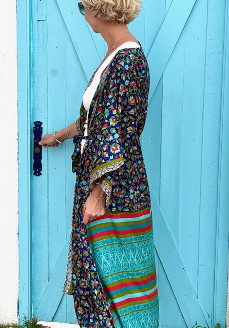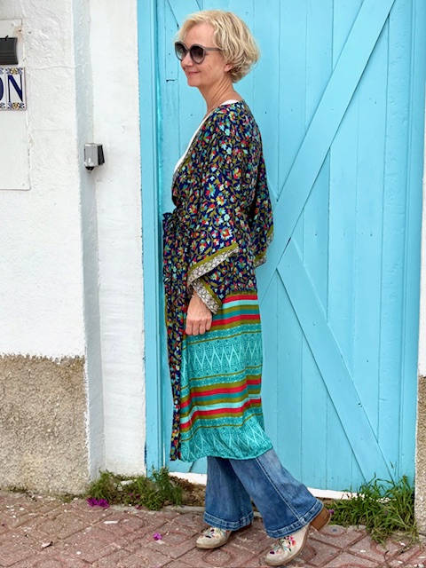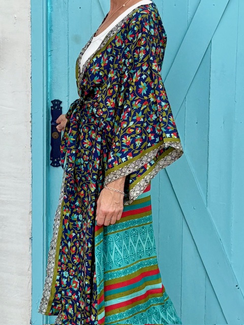 Unser Vintage Seidenkimono aus Ibiza ist ein echtes Unikat – handgefertigt aus recycelten indischen Saris.