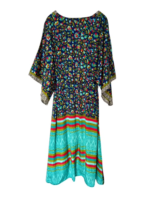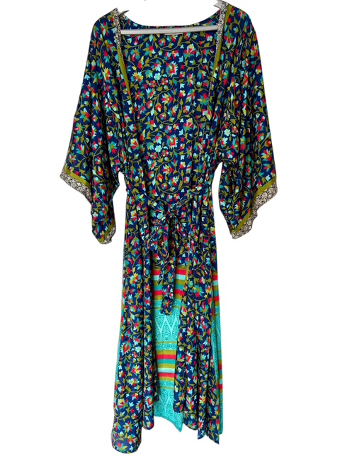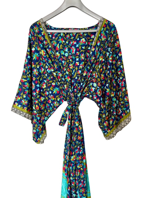 Vintage Seidenkimono aus Ibiza – Handgefertigtes Unikat in blau mit buntem Blumenmuster