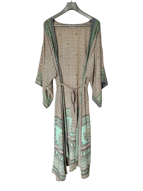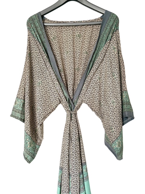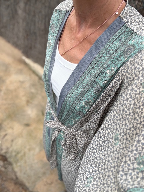 Vintage Seidenkimono aus Ibiza – Handgefertigtes Unikat in zarten kühlen Farbtönen